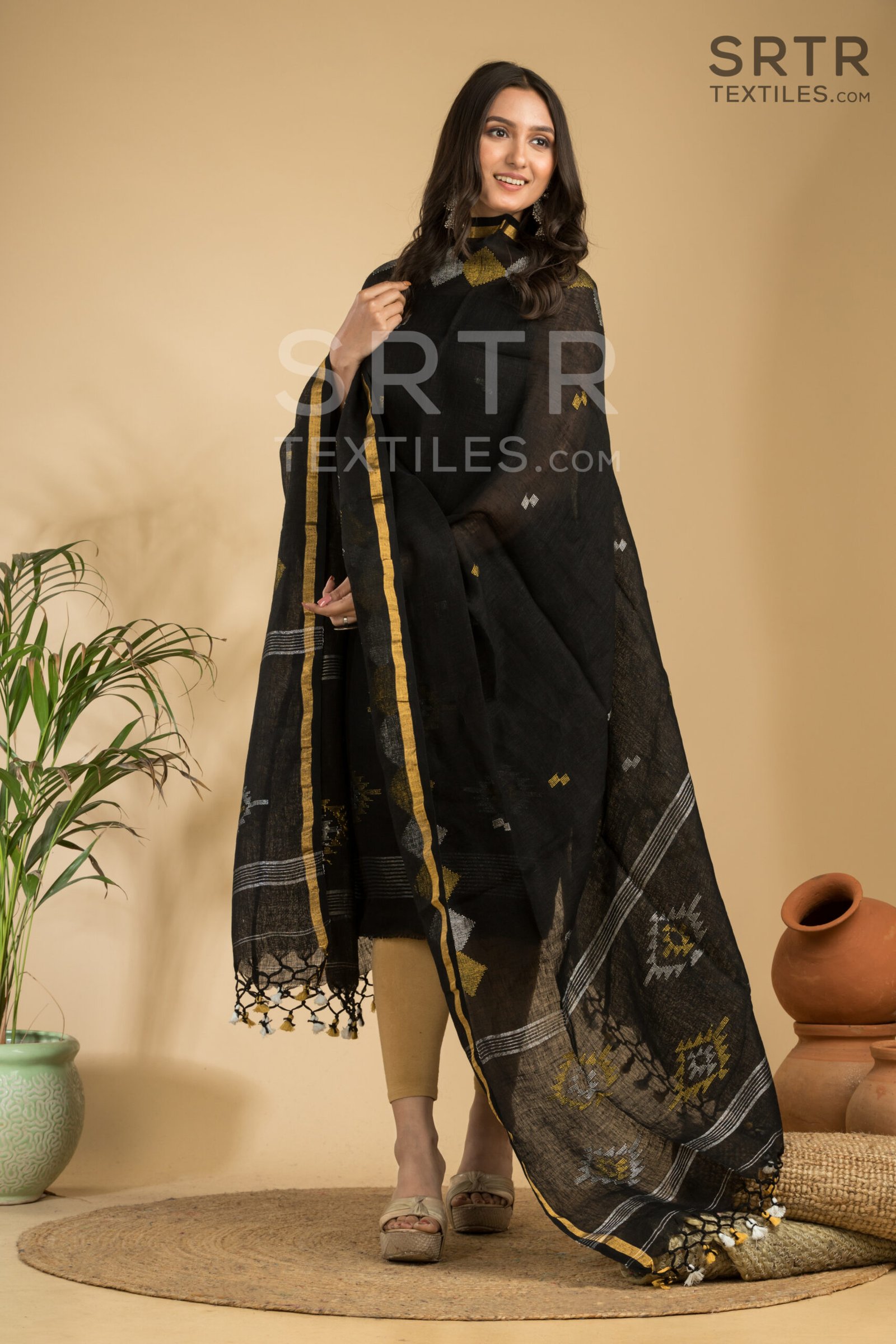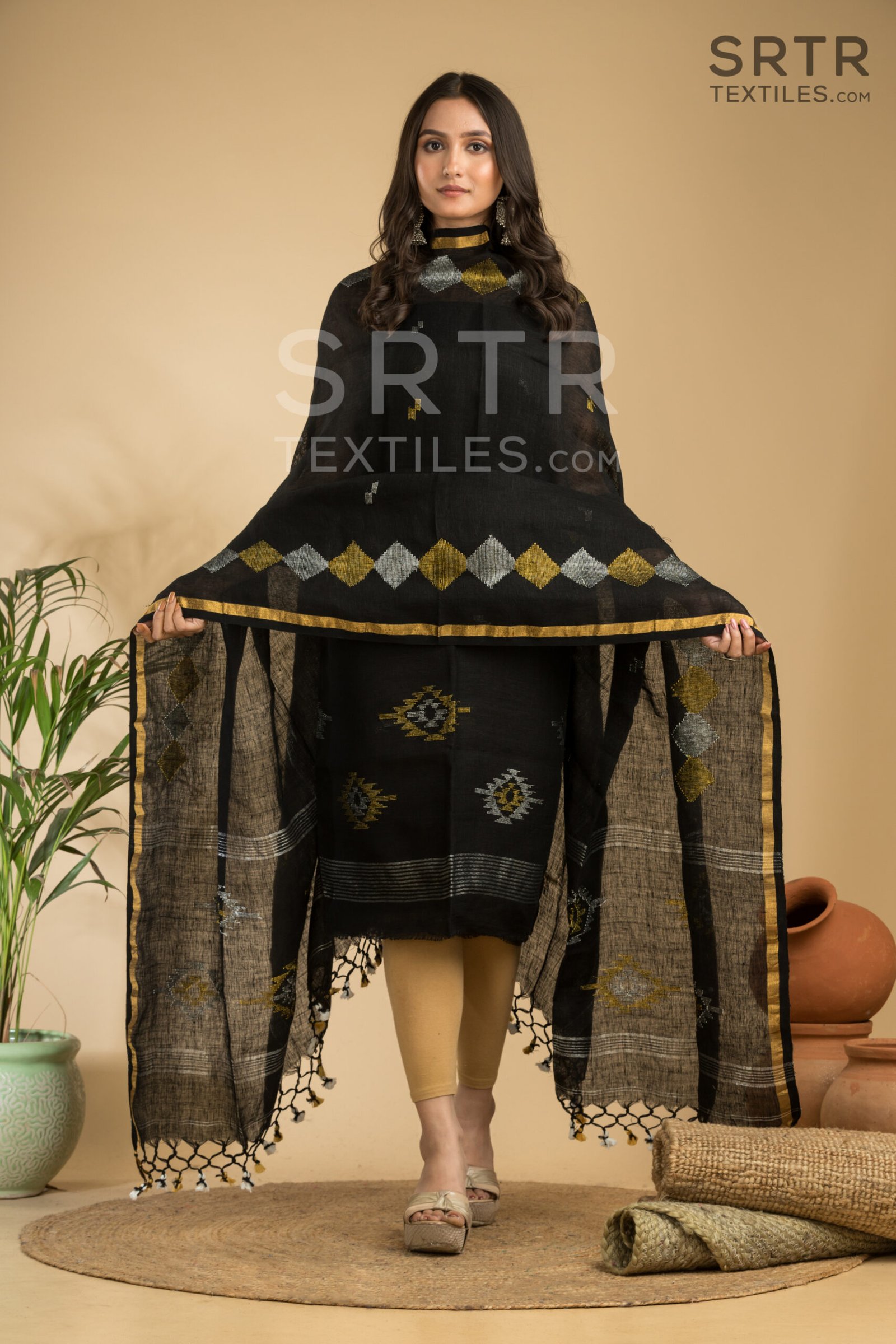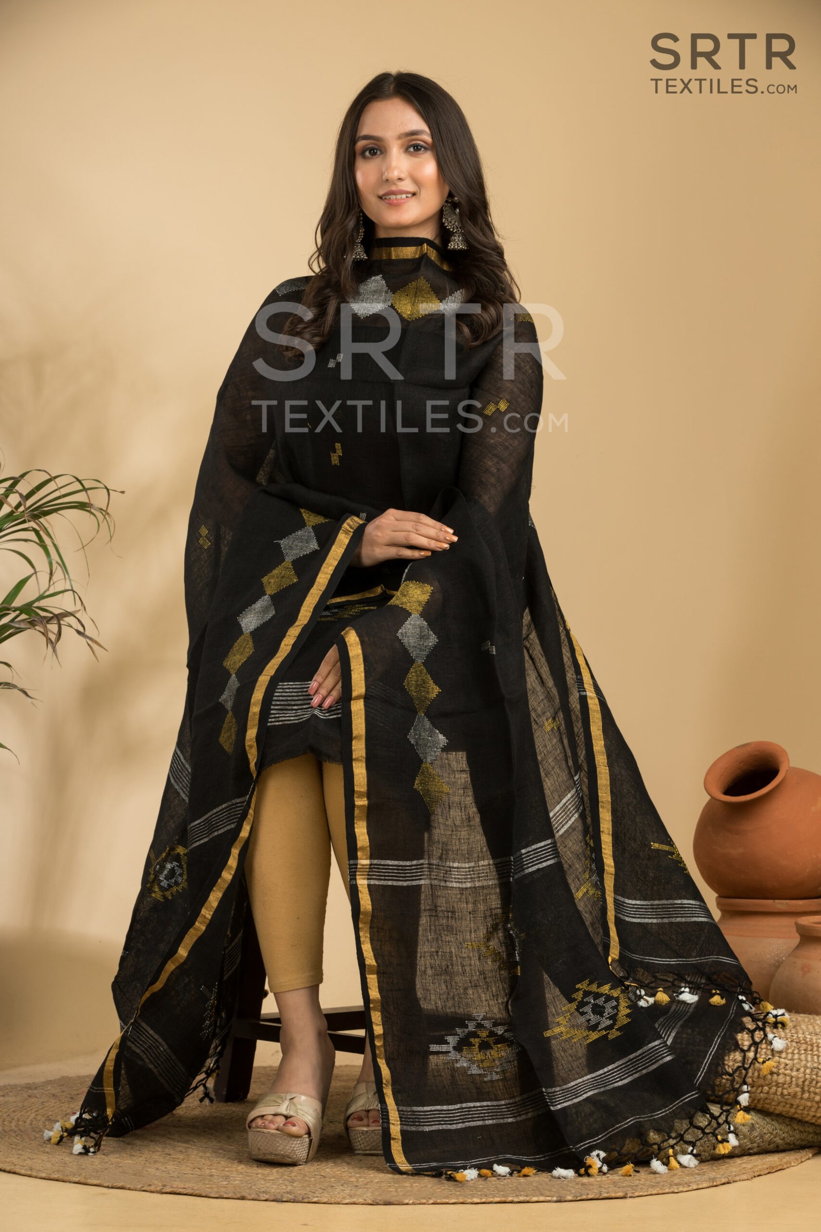 Classic Black Handloom Linen Suit with Geometric Motifs– Elegant 2-Piece Set