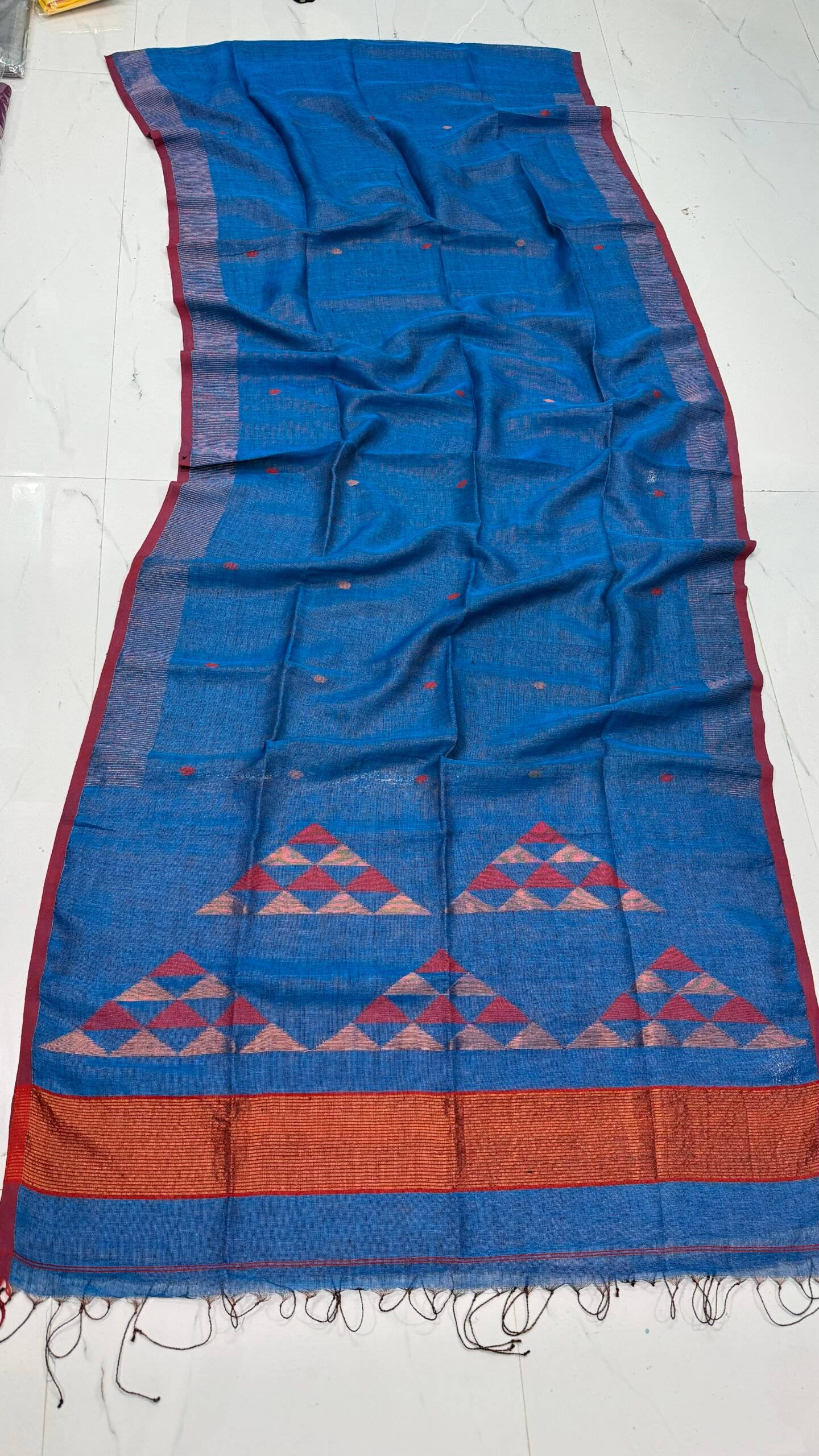 Step into the world of exquisite craftsmanship with our Handwoven Linen Tissue Jamdani Saree. This stunning piece is designed for those who appreciate timeless beauty, versatility, and artistry in their wardrobe. Meticulously handwoven by seasoned artisans, this saree combines tradition and modernity, making it perfect for every occasion—from casual gatherings to celebratory events.