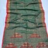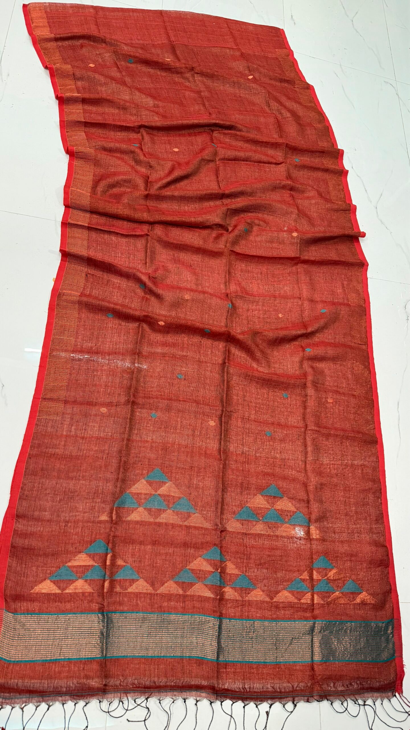 Elegant handwoven linen tissue saree featuring subtle buttis, geometric pallu motifs, and a rich contrast border. Comes with a matching blouse piece.