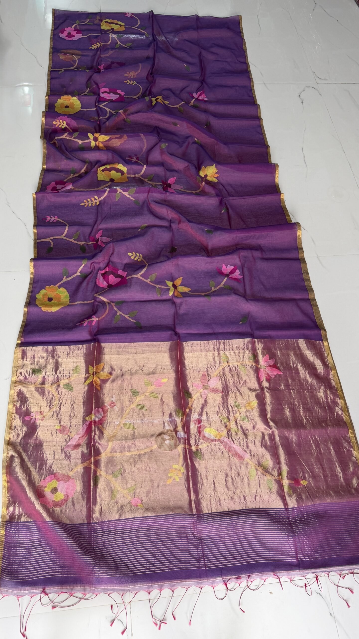 The sophisticated grey body beautifully highlights the vibrant handwoven flowers in shades of pink, yellow, and teal, while the golden zari border adds a touch of understated luxury. The lightweight texture ensures all-day comfort, making it perfect for festive occasions, cultural events, and elegant day wear.