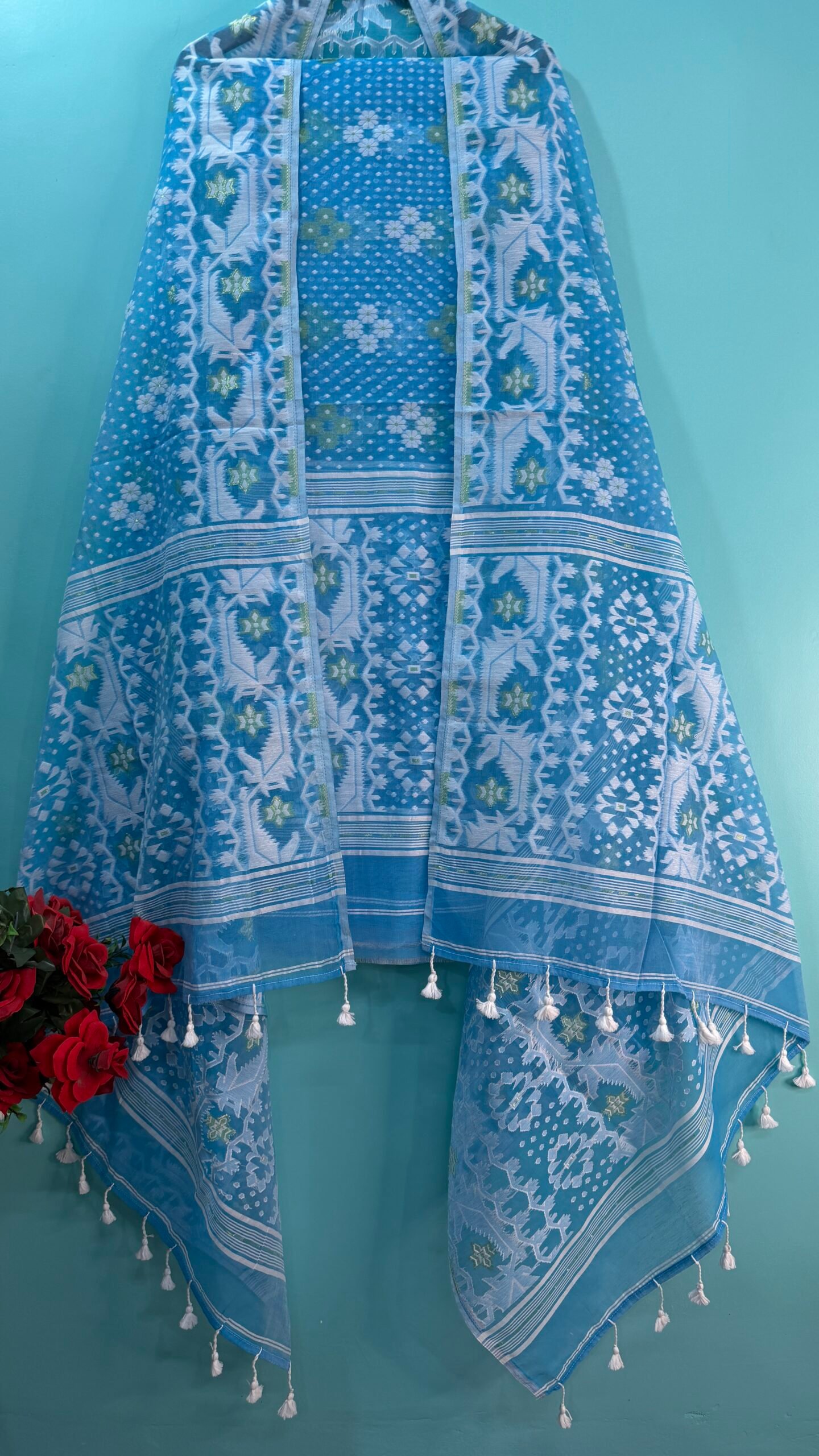 Experience timeless elegance with this Pure Jamdani Cotton Suit Set, crafted with traditional handloom artistry. Jamdani is a heritage weaving technique where delicate motifs are woven directly into the fabric using an extra weft method, making each piece unique and luxurious