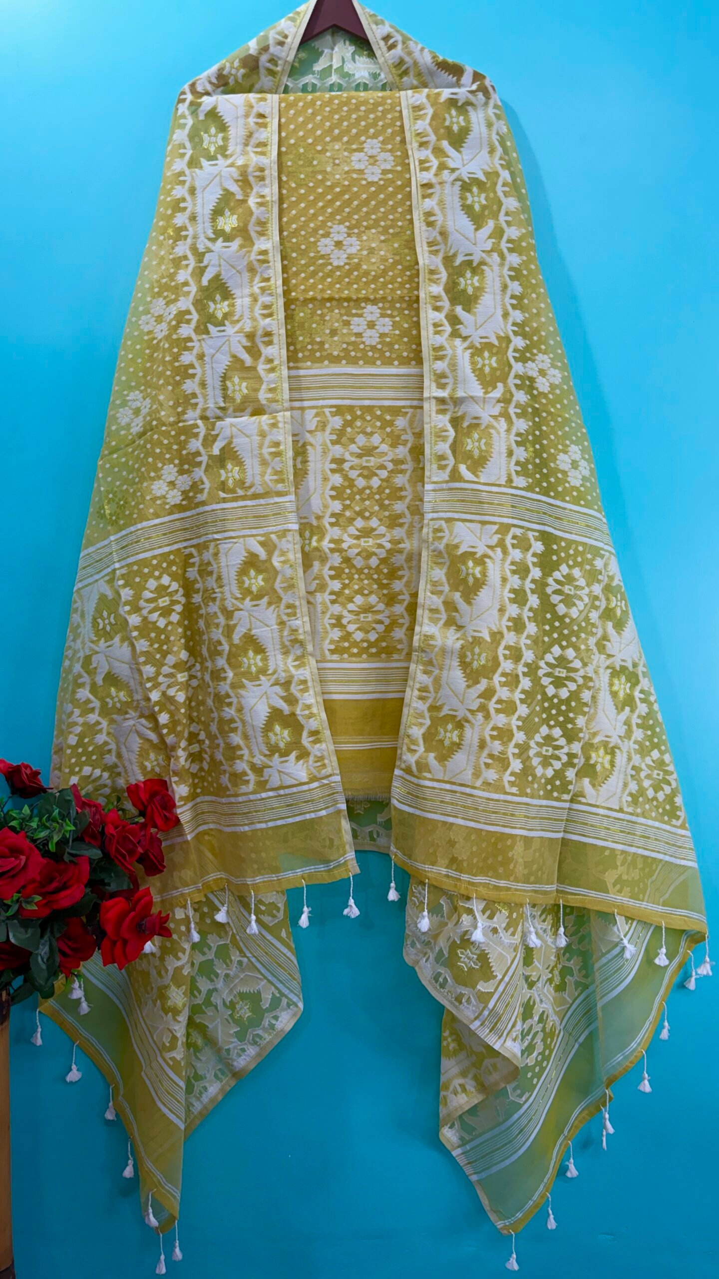 Experience timeless elegance with this Pure Jamdani Cotton Suit Set, crafted with traditional handloom artistry. Jamdani is a heritage weaving technique where delicate motifs are woven directly into the fabric using an extra weft method, making each piece unique and luxurious
