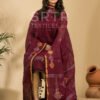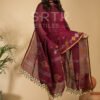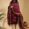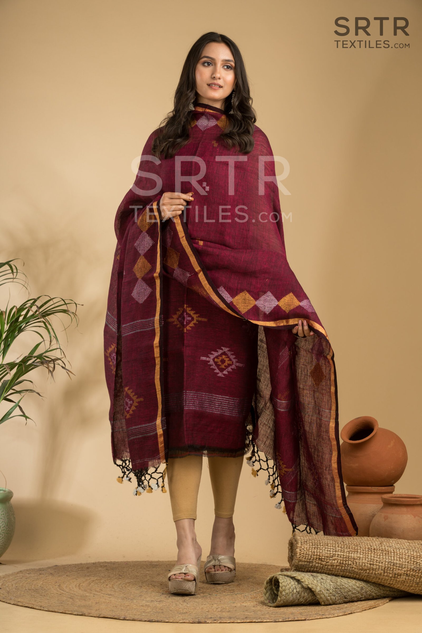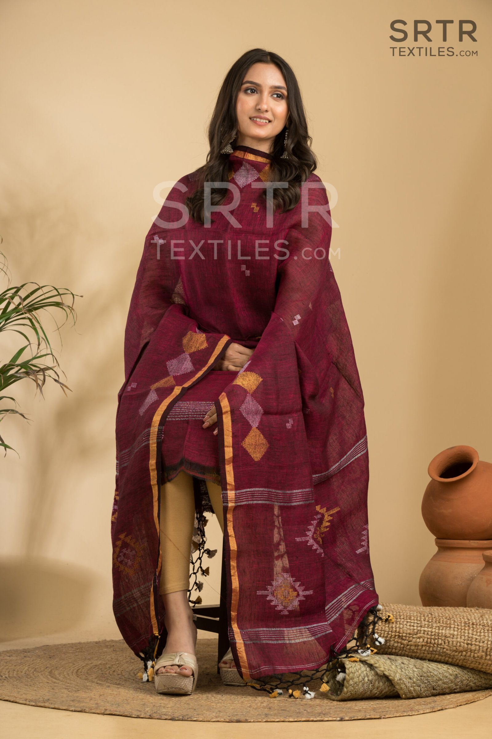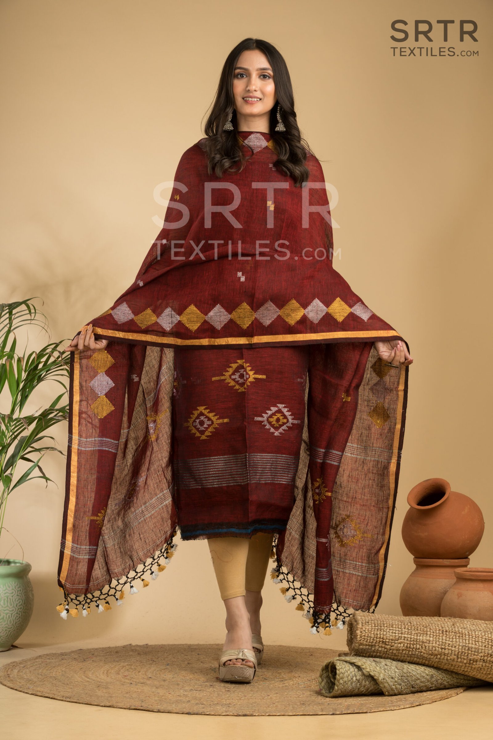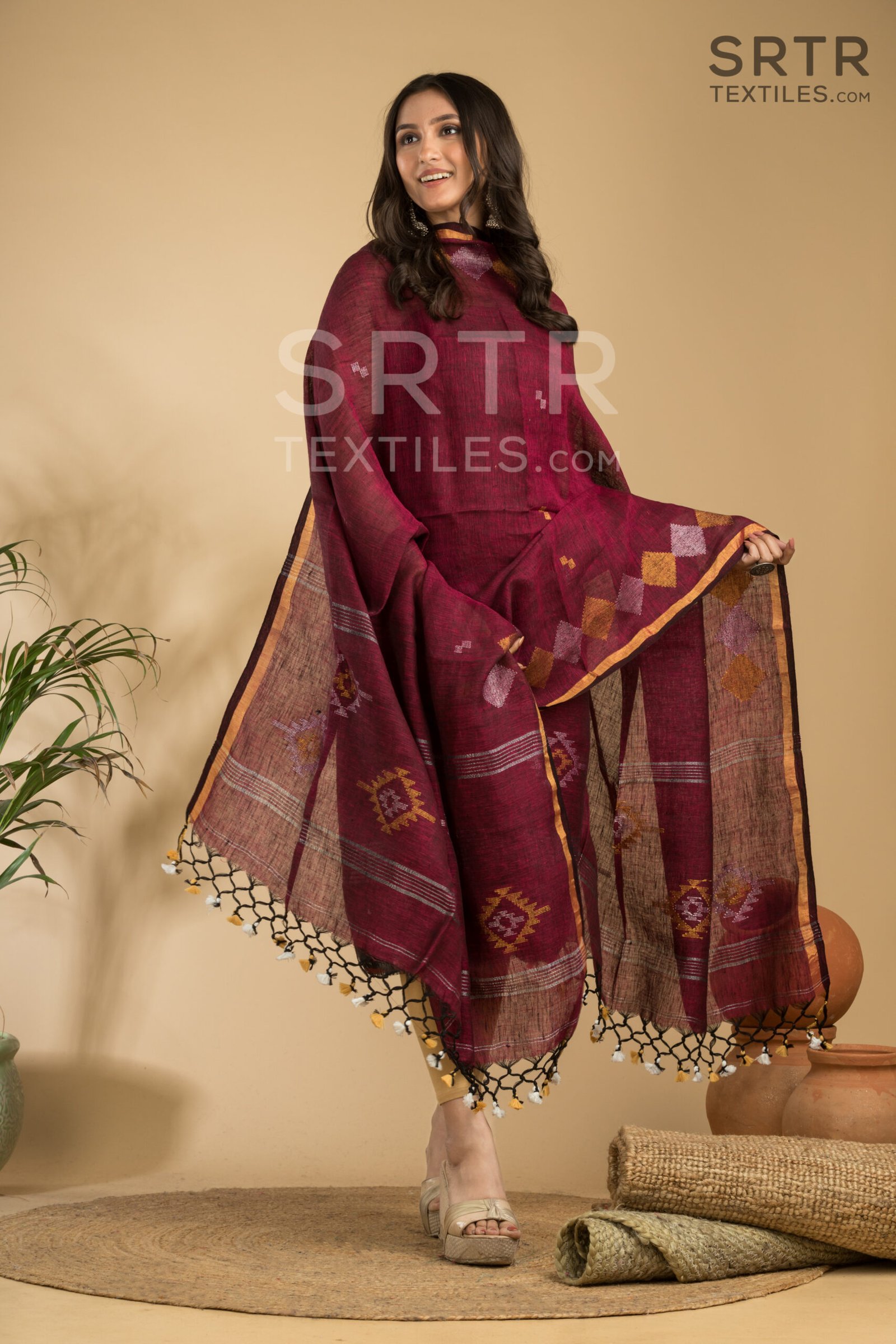 Maroon Handloom Linen Suit with Traditional Geometric Motifs
