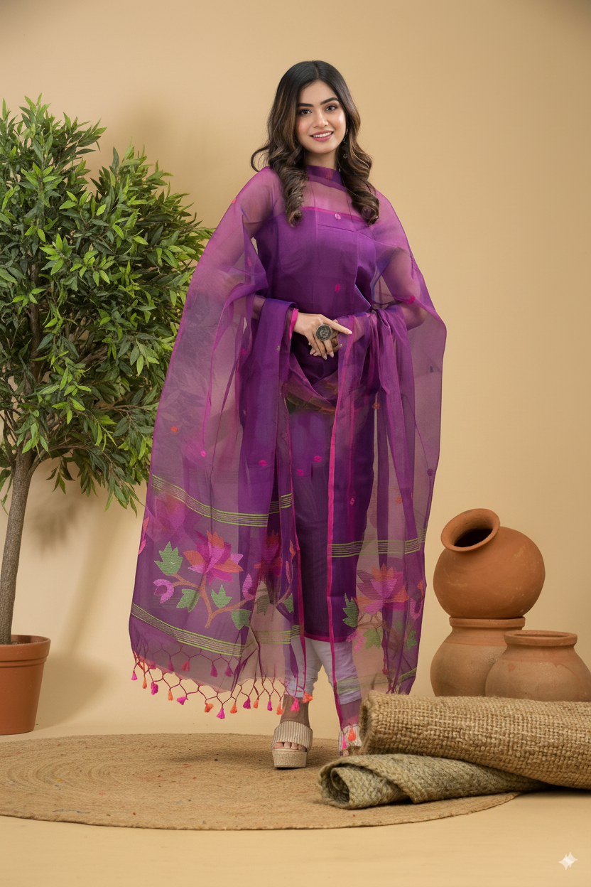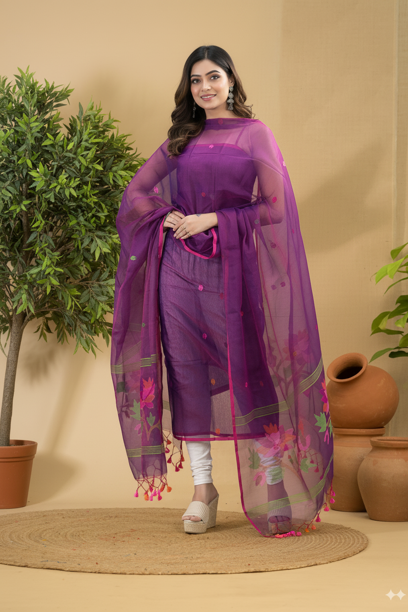 The Muslin Unstitched Jamdani is a timeless addition to your ethnic wardrobe, offering both style and comfort. This 2-piece set includes a beautifully stitched kurta, a (matching cotton bottom) and a dupatta, all crafted from premium-quality muslin fabric. The soft, breathable material ensures all-day comfort while the intricate patterns add a delicate charm.