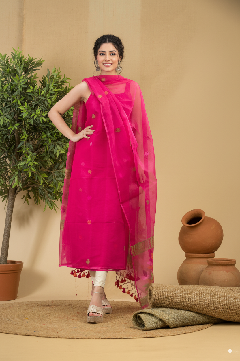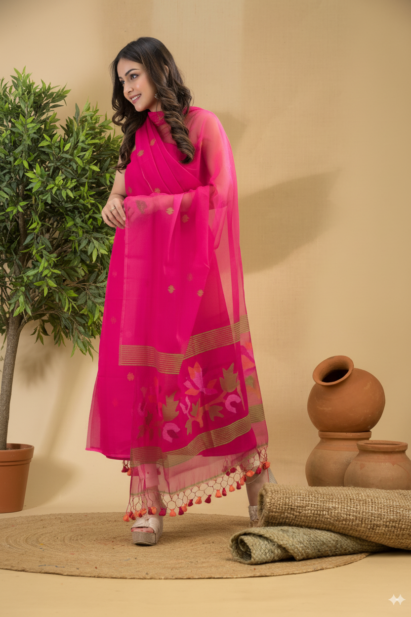 The Muslin Unstitched Jamdani is a timeless addition to your ethnic wardrobe, offering both style and comfort. This 2-piece set includes a beautifully stitched kurta, a (matching cotton bottom) and a dupatta, all crafted from premium-quality muslin fabric. The soft, breathable material ensures all-day comfort while the intricate patterns add a delicate charm.