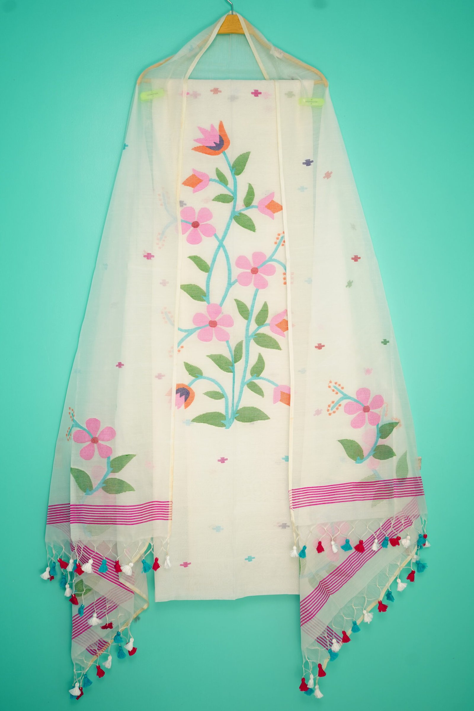 This 2-piece set includes a meticulously designed top and a matching dupatta, showcasing harmonious patterns and delightful attention to detail. Invest in timeless elegance today with the Muslin Jamdani Suit – unstitched for your creativity, woven for your grace.