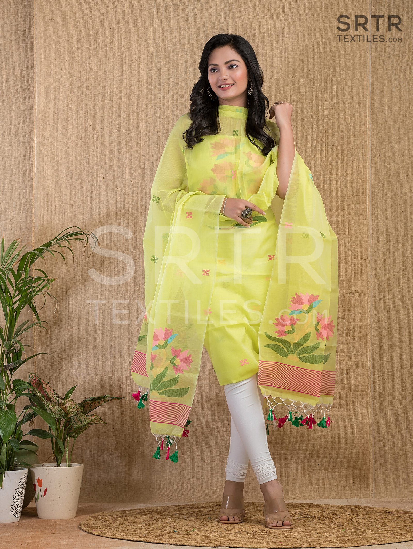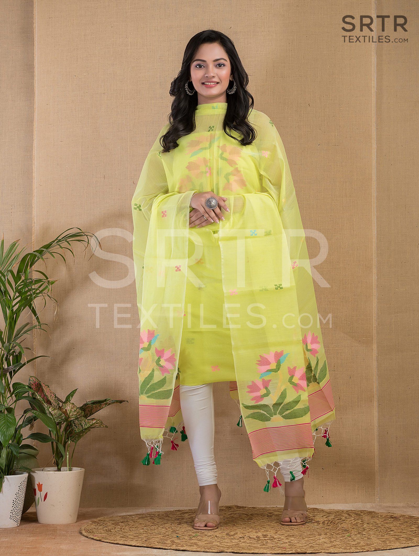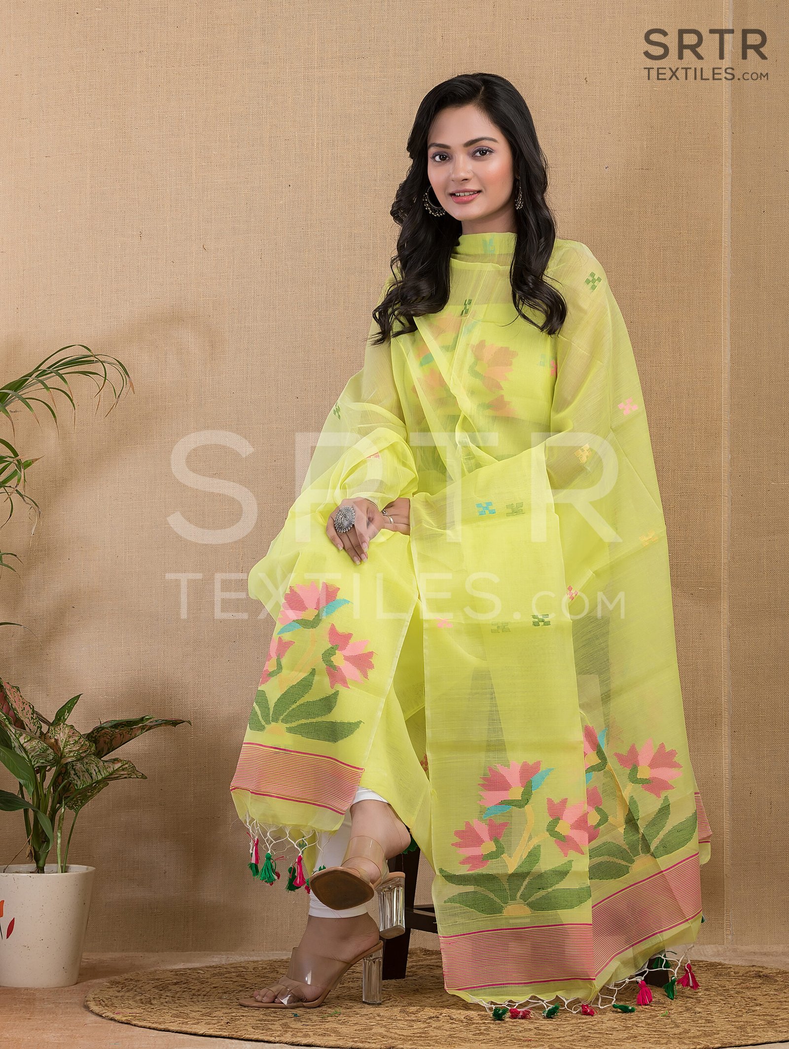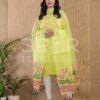 Bright Lemon Yellow Muslin Unstitched Jamdani Suit – Elegant 2-Piece Set