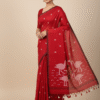 The saree features a vibrant red base that exudes confidence and grace, complemented by delicate white woven motifs scattered gracefully across the body. The texture of pure cotton ensures softness, breathability, and effortless drape, making it ideal for both everyday wear and special occasions.