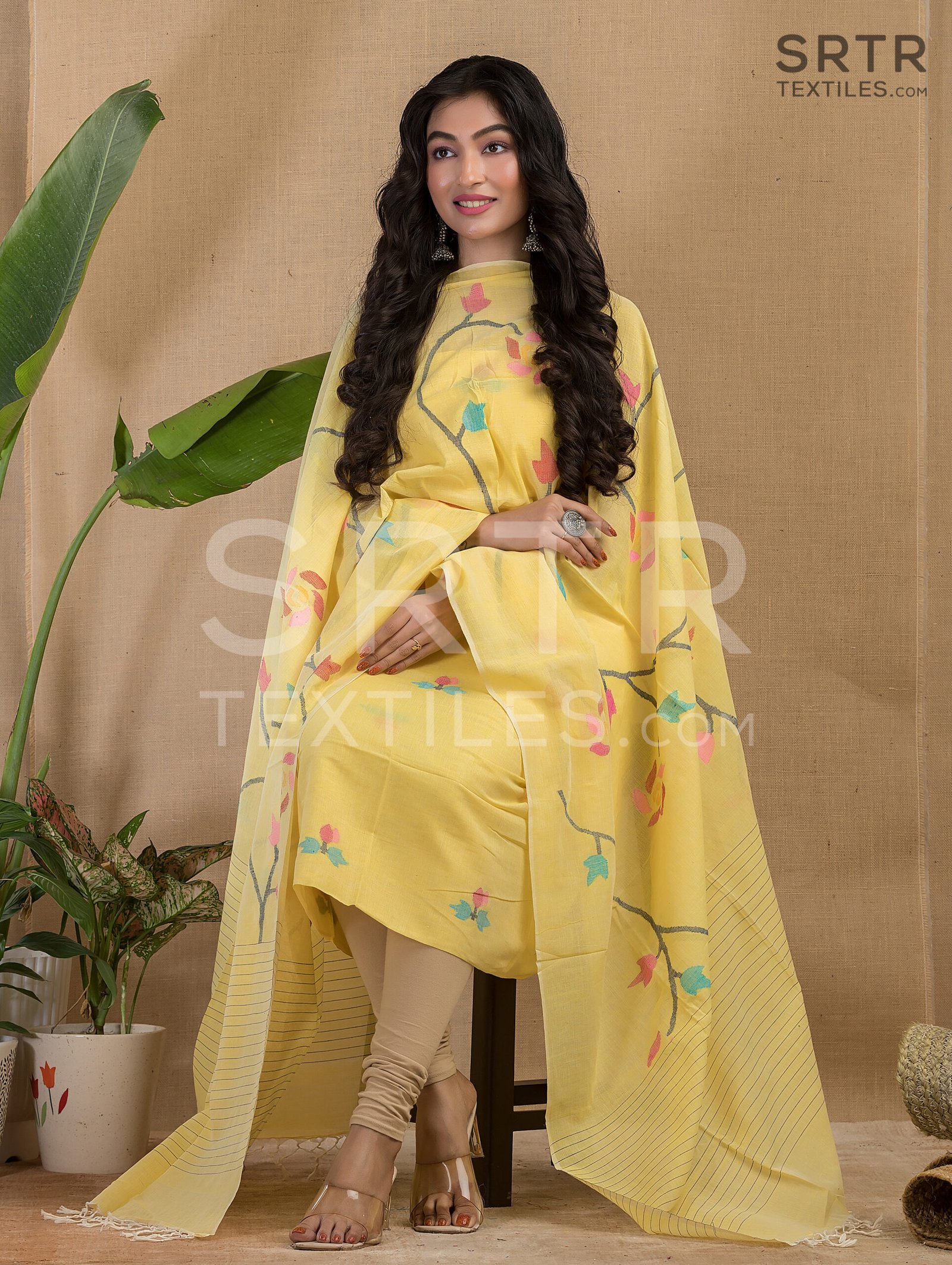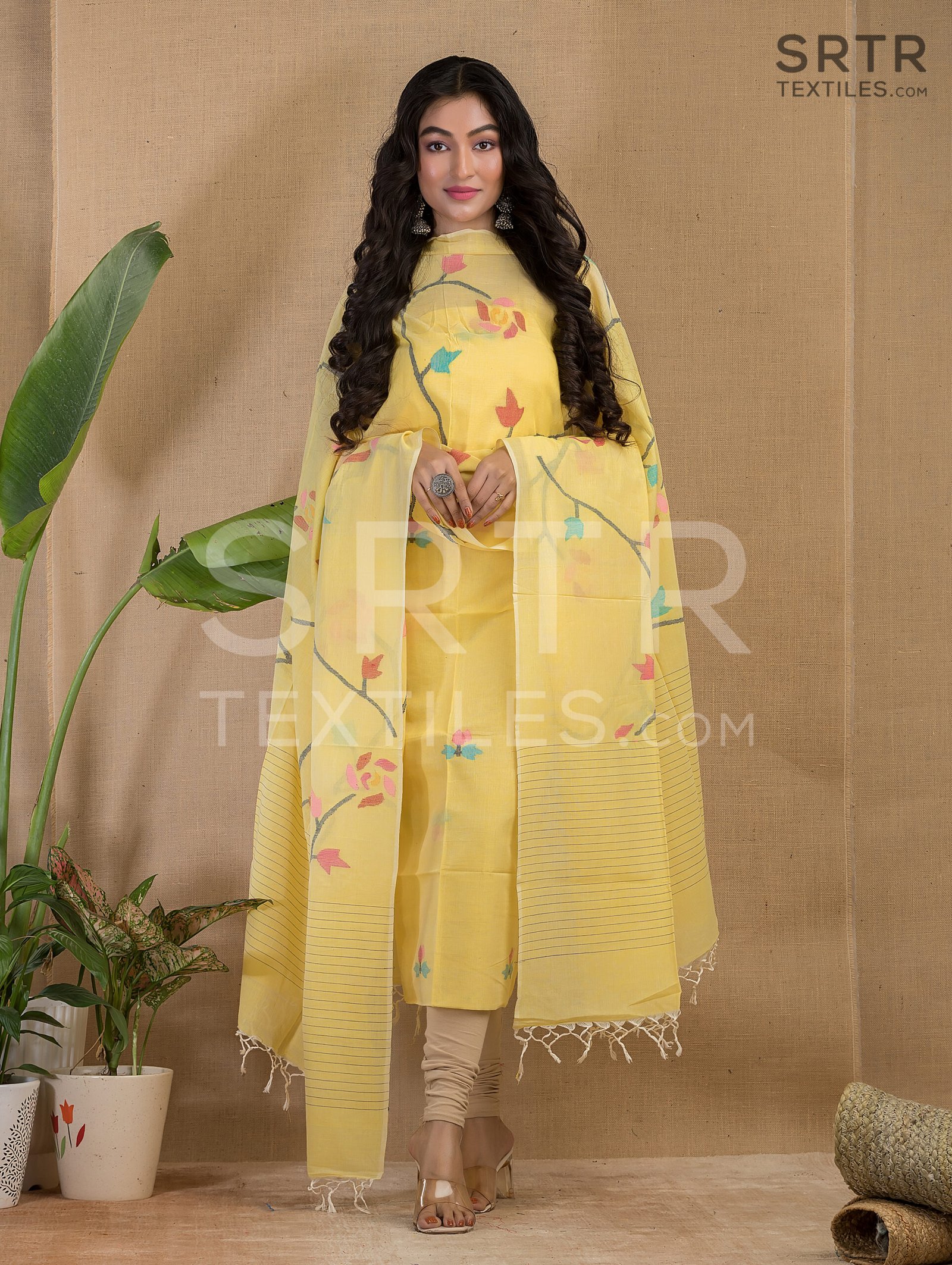 Crafted from 100% pure cotton, this Jamdani suit offers a breathable and lightweight feel, making it ideal for long hours of wear. Whether you are attending a formal event or enjoying a casual day out, the soft fabric ensures maximum comfort without compromising style. The handwoven Jamdani patterns, distinctive for their rich textures and vivid motifs, add a touch of refinement that stands out from the rest.