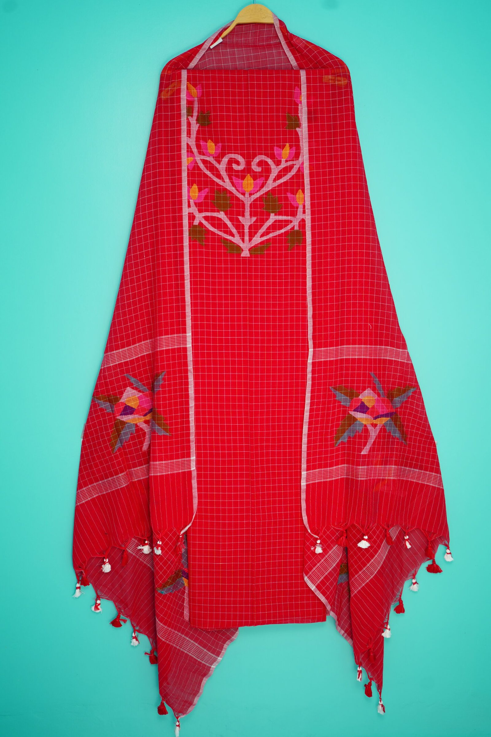 The Pure Cotton Jamdani Suit is crafted from 100% high-quality cotton, promising lightness and breathability in every season. The unstitched top fabric, measuring 2.5 meters, allows you to tailor it to your unique style and preference, while the dupatta (2.5 meters in length) complements with its soft and ethereal texture. The focus is on delivering unmatched comfort without compromising its aesthetic appeal. This suit allows you to personalize your look and express your individuality, making it a versatile addition to your wardrobe.