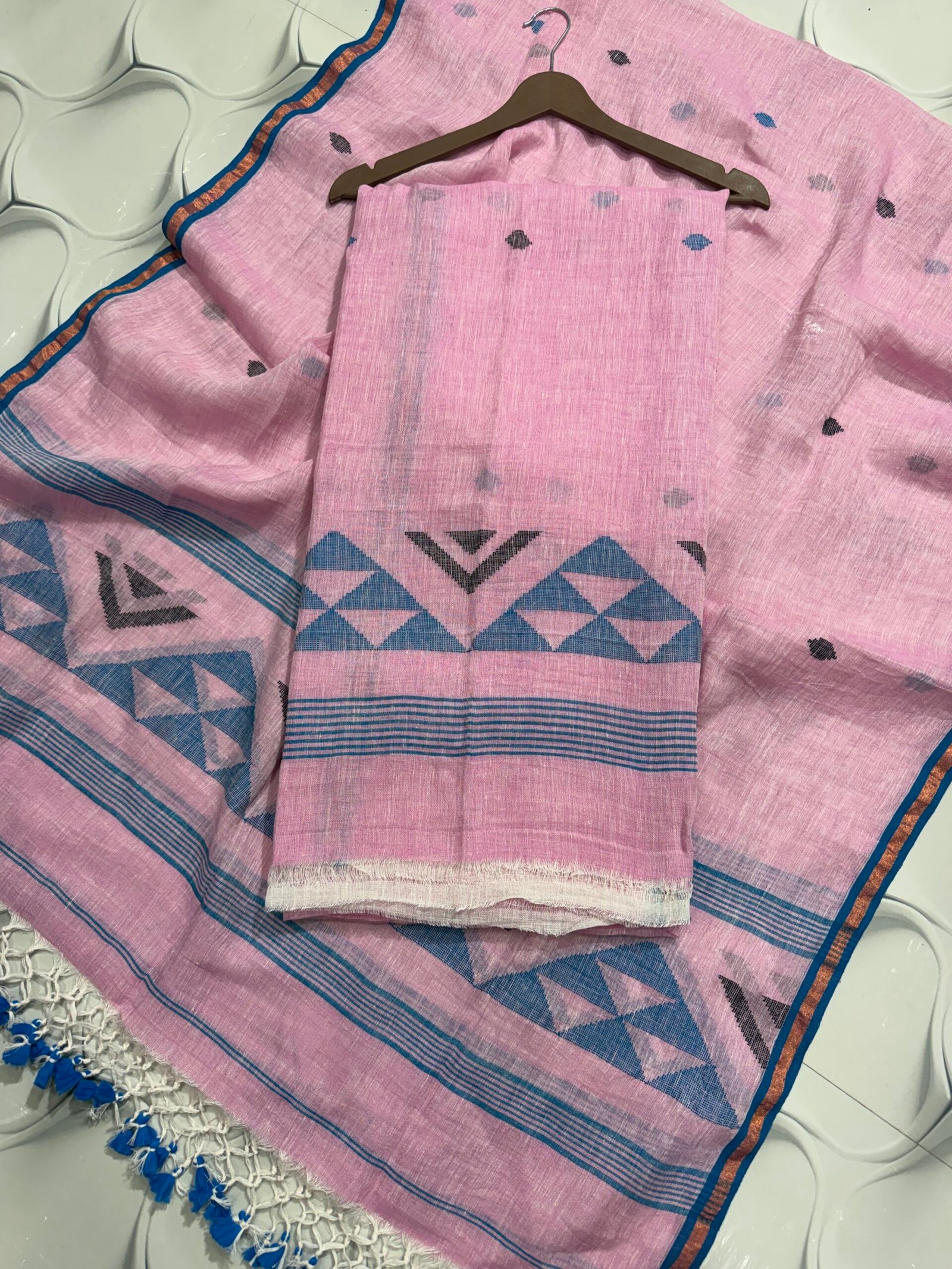 Elegant pure linen Jamdani unstitched suit featuring beautiful woven patterns. Lightweight, breathable, and perfect for any occasion.