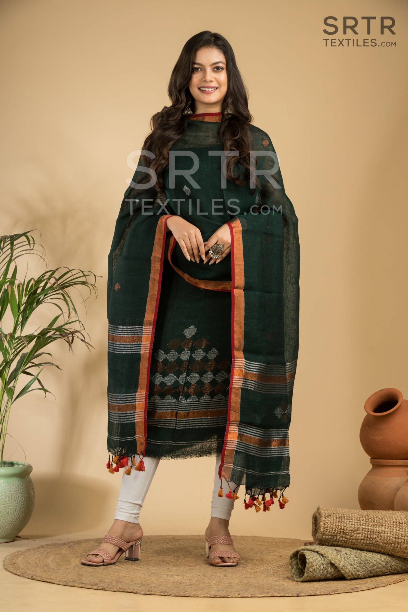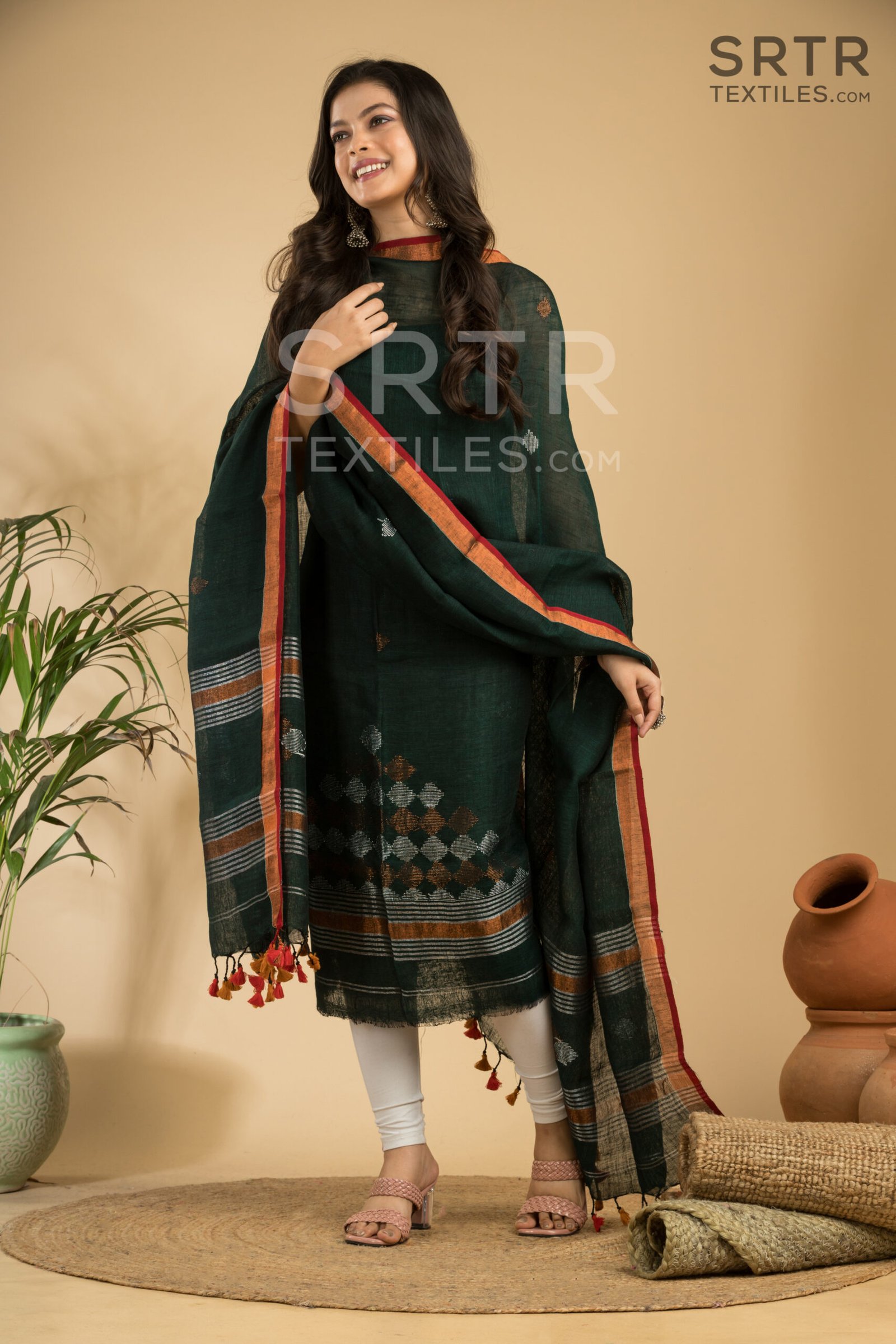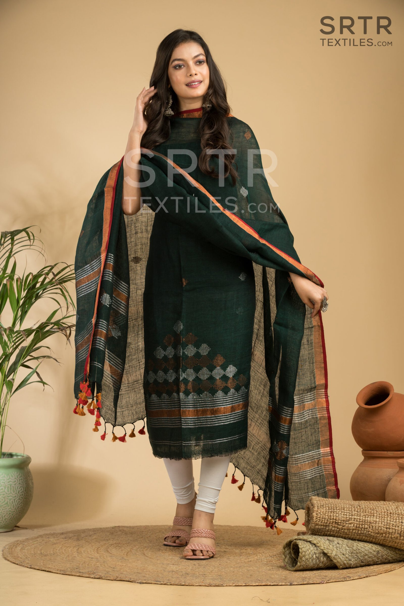 What makes the Pure Linen Unstitched Jamdani Suit truly special is its unstitched nature, giving you the freedom to customize it according to your body measurements and style preferences. You can design it to reflect your unique personality; choose from a variety of cuts and stitching styles that best express who you are. Pair it with your favorite accessories and footwear to create a look that turns heads wherever you go.